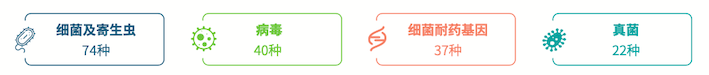 ☆ 廣譜:一次檢測完成74種細(xì)菌及寄生蟲、40種病毒、22種真菌、37種耐藥基因檢測;