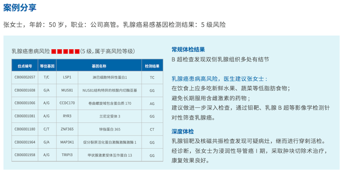愛身譜®乳腺癌易感基因檢測通過檢測受檢者與乳腺癌相關(guān)的易感基因,精準(zhǔn)評估疾病發(fā)生風(fēng)險,在疾病發(fā)生之前有針對性的預(yù)防,改善自身的生活環(huán)境和生活習(xí)慣,從而有效降低或避免乳腺癌的發(fā)生。