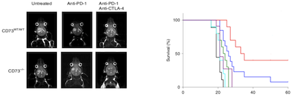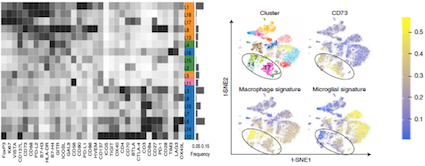 2019年12月,Nature Medicine發(fā)表對(duì)免疫檢查點(diǎn)治療效果好和不好的5種癌癥類型,共94例患者進(jìn)行單細(xì)胞蛋白和單細(xì)胞RNA測序,在多形性膠質(zhì)母細(xì)胞瘤中發(fā)現(xiàn)了一個(gè)獨(dú)特的CD73hi巨噬細(xì)胞群,在抗PD-1治療后仍然存在。通過構(gòu)建CD73敲除鼠發(fā)現(xiàn)CD73的缺失提高了抗CTLA-4和抗PD-1治療的多形性膠質(zhì)母細(xì)胞瘤小鼠模型的存活率。證實(shí)CD73是一種特異性的免疫治療靶點(diǎn),可提高多形性膠質(zhì)母細(xì)胞瘤免疫檢查點(diǎn)治療的抗腫瘤免疫應(yīng)答。