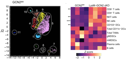 2019年12月,Science Immunology發(fā)表對(duì)黑色素瘤患者進(jìn)行單細(xì)胞蛋白和單細(xì)胞RNA測序,發(fā)現(xiàn)腫瘤微環(huán)境的變化:巨噬細(xì)胞和髓樣抑制細(xì)胞的促炎性活化的增加,腫瘤內(nèi)CD8+T細(xì)胞中的干擾素-γ表達(dá)。GCN2通過促進(jìn)轉(zhuǎn)錄因子CREB-2/Atf4的翻譯增加而改變了髓樣抑制細(xì)胞的功能,其中CREB-2/Atf4是小鼠和人類中巨噬細(xì)胞和髓樣抑制細(xì)胞成熟所必需的,而且利用小干擾RNA靶向Atf4可降低腫瘤生長,揭示免疫腫瘤學(xué)潛在的治療靶點(diǎn)GCN2在腫瘤免疫反應(yīng)中的作用。