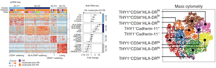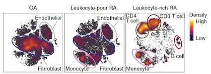 2019年5月,Nature Immunology報(bào)道關(guān)于類風(fēng)濕性關(guān)節(jié)炎(RA)的研究。作者對(duì)來自RA或骨關(guān)節(jié)炎(OA)患者的51個(gè)滑膜組織樣品的T細(xì)胞、B細(xì)胞、單核細(xì)胞和成纖維細(xì)胞進(jìn)行單細(xì)胞RNA測序(scRNA-seq)、質(zhì)譜流式檢測、 轉(zhuǎn)錄組測序(bulk RNA-seq)和普通流式細(xì)胞檢測。利用基于5,265個(gè)scRNA-seq圖譜典型相關(guān)分析的綜合策略,作者鑒定了18個(gè)獨(dú)特的細(xì)胞群。通過在單細(xì)胞層面對(duì)跨數(shù)據(jù)模態(tài)進(jìn)行整合,精確定義了特定細(xì)胞亞群在RA和慢性炎癥中的作用。