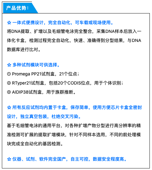 該系統(tǒng)基于微流控芯片技術(shù),配套全集成芯片卡盒和數(shù)據(jù)分析軟件,集DNA提取、PCR擴(kuò)增、毛細(xì)管電泳于一體,自動(dòng)生成分型結(jié)果,2小時(shí)即可獲得DNA分型。既可用于重大事故、自然災(zāi)害的人員身份快速識(shí)別和案件現(xiàn)場(chǎng)檢材的快檢快篩,也可用于邊防、公安等基層機(jī)關(guān)對(duì)敏感、可疑人員身份的快速識(shí)別和排查。儀器操作簡(jiǎn)單便捷,無需專業(yè)技術(shù)人員操作,可檢測(cè)的樣本包括:血卡、唾液卡、口腔拭子卡等。無使用環(huán)境要求,既可在實(shí)驗(yàn)室、辦公室、窗口單位,也可與警用現(xiàn)勘車配套移動(dòng)式檢測(cè),具有良好的抗震性、防污染措施,使用無需校準(zhǔn)。同時(shí)兼容多款國(guó)內(nèi)外DNA試劑,具備個(gè)體識(shí)別和族群推斷功能。