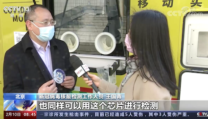? ? ? “這個芯片相當于一個微型的實驗室它集成了核酸的提取、核酸的擴增檢測,在芯片里面全自動完成,45分鐘以后,我們就可以在系統(tǒng)里看到結(jié)果?!北本┎W晶典生物技術有限公司副總裁王國青表示。信息結(jié)果將同步推送到健康寶,除了人的樣本以外,環(huán)境樣本也可以用全集成芯片進行檢測。