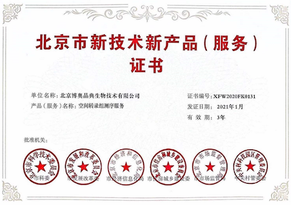 “北京市新技術(shù)新產(chǎn)品(服務(wù))認(rèn)定”旨在推動(dòng)高新技術(shù)產(chǎn)業(yè)的發(fā)展,作為北京市新技術(shù)新產(chǎn)品,應(yīng)擁有自主知識產(chǎn)權(quán),并具有技術(shù)先進(jìn)性和創(chuàng)新性。本次喜獲“空間轉(zhuǎn)錄組測序服務(wù)”榮譽(yù)證書是各委員會(huì)對博奧晶典創(chuàng)新能力的高度贊揚(yáng)和肯定,同時(shí)體現(xiàn)了博奧晶典空間轉(zhuǎn)錄組測序服務(wù)在行業(yè)內(nèi)的技術(shù)優(yōu)勢。