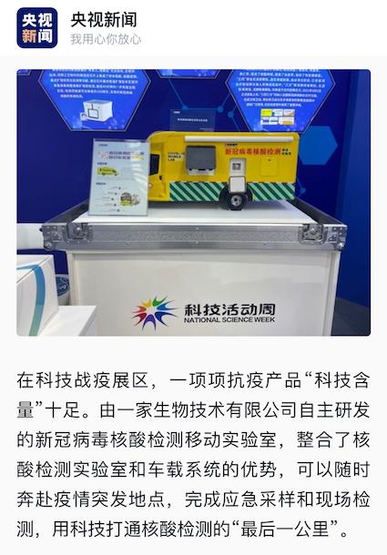 科技周上,全集成芯片實(shí)驗(yàn)室系統(tǒng)、全集成新冠病毒核酸檢測移動(dòng)實(shí)驗(yàn)室也吸引了諸多媒體打卡留念、競相報(bào)道。