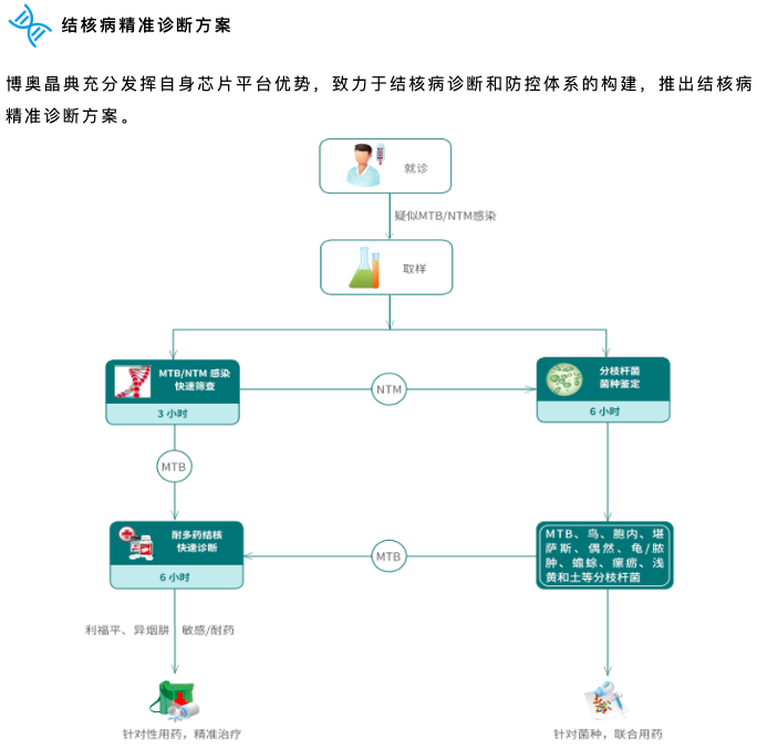 結核病精準診斷方案中包含:分枝桿菌核酸檢測試劑盒(PCR-熒光探針法)、分枝桿菌菌種鑒定試劑盒(DNA微陣列芯片法)、結核分枝桿菌耐藥基因檢測試劑盒(DNA微陣列芯片法)。這三款診斷產(chǎn)品,環(huán)環(huán)相扣,涵蓋了結核快速篩查、菌種鑒定、耐多藥結核病快速診斷,構成了晶芯®結核病快速分子診斷系統(tǒng)。結核診斷、輔助用藥全面覆蓋,真正實現(xiàn)結核全程分子監(jiān)控。
